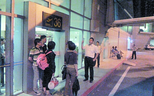 凌晨1點上了一架飛機,3點又被通知下來。深夜,一些乘客干脆站到候機樓門口等待飛機到來。
