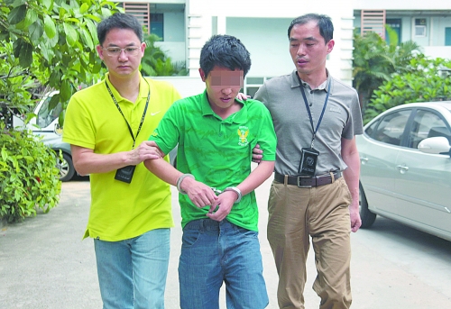 昨日,深圳警方將多次撥打電話謊稱飛機上有炸彈的犯罪嫌疑人王某(中)刑拘。 新華社發(fā)