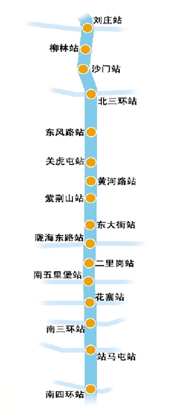 地鐵2號(hào)線為城市南北向軌道骨干線,其中一期工程起于劉莊站,止于南四環(huán)站,設(shè)車站16座,線路長(zhǎng)20.6公里,沿花園路、紫荊山路敷設(shè)。