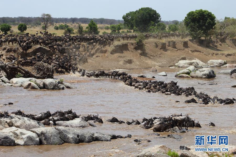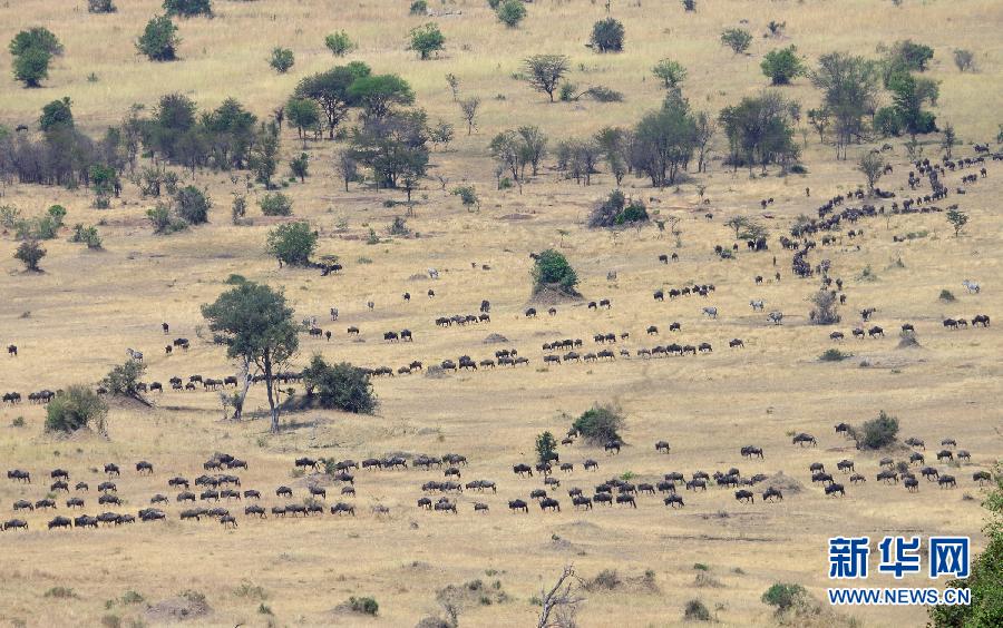 這是8月17日在坦桑尼亞塞倫蓋蒂國(guó)家公園內(nèi)拍攝的角馬遷徙隊(duì)伍。每年7月至9月是坦桑尼亞的旱季,為了追逐水源和青草,以角馬和斑馬為主的數(shù)以百萬(wàn)計(jì)的食草動(dòng)物從塞倫蓋蒂向肯尼亞馬賽馬拉遷徙。這場(chǎng)“地球上最壯觀的動(dòng)物大遷徙”全程超過(guò)1000公里,動(dòng)物在往返途中需兩次渡過(guò)鱷魚(yú)出沒(méi)、危機(jī)重重的馬拉河。新華社記者張平攝