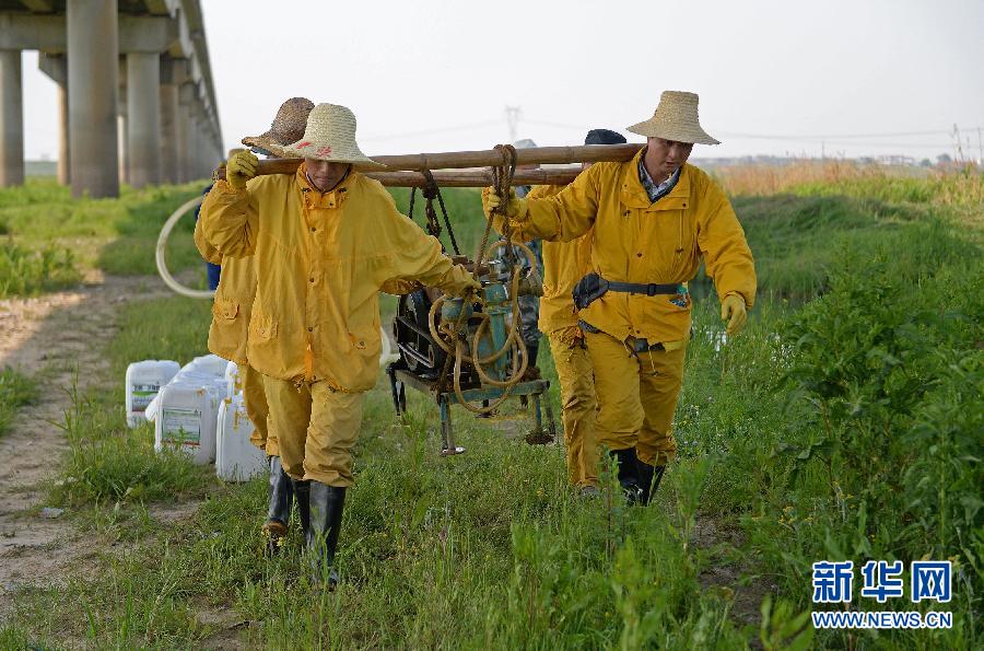 滅螺隊隊員扛著150米的皮管對重點地區(qū)進行藥物滅螺(4月14日攝)。