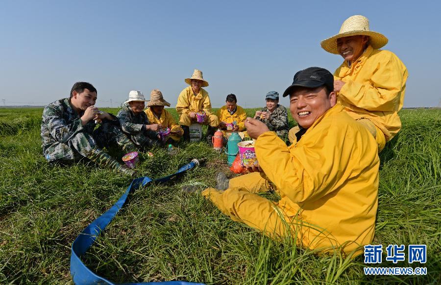滅螺隊員在草洲上吃自帶的方便面和干糧(4月14日攝)。 新華社記者 萬象 攝