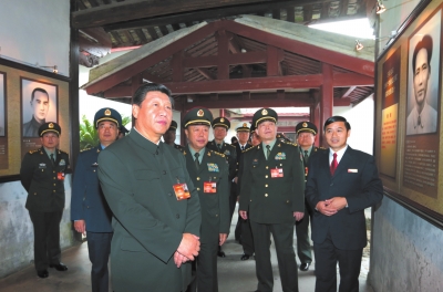 10月31日上午,習(xí)近平帶領(lǐng)全體中央軍委委員一起參觀會址。習(xí)近平來到當(dāng)年毛澤東作政治報告的廳堂,凝望著廊柱上富有鮮明戰(zhàn)斗性的標(biāo)語,注視著當(dāng)年會議代表取暖留下的斑斑炭火印跡,同大家一起回憶先輩們探尋革命道路時篳路藍(lán)縷、艱辛奮斗的情景,并向大家介紹他每次來古田參觀的情形和感受。