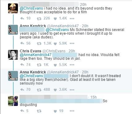 《美國隊長》克里斯·埃文斯(Chris Evans)也表示:“天啊,我再也無法像過去那樣看待這部片子、貝托魯奇或白蘭度,這已經(jīng)超越了惡心,我覺得很憤怒!”他的發(fā)文也引來許多網(wǎng)友認同,連《歌喉贊》女主角安娜·肯德里克(Anna Kendrick)也在底下回應(yīng)表示,“施耐德女士之前曾在訪談中說過,‘我曾提起過這件事情,聽的人(男人們)還翻白眼’?!?/p>