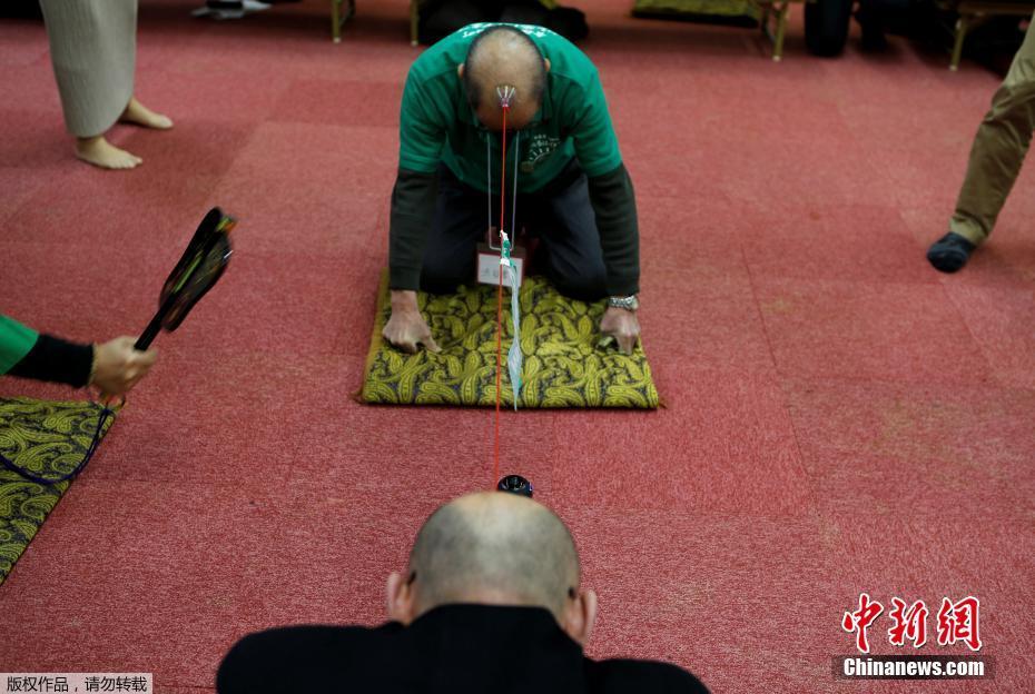 當(dāng)?shù)貢r間2月22日,日本一謝頂男人俱樂部里,成員將吸盤吸附在頭頂進(jìn)行拔河游戲。