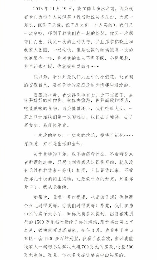 5月23日凌晨,劉洲成發(fā)微博回應家暴致前妻林苗流產及要求前妻出錢買房等傳聞。劉洲成更是曬出了昔日的聊天記錄、代付清單、借記卡賬戶歷史明細清單等證據,疑似反駁前妻所述不實。劉洲成長文截圖6 劉洲成長文截圖7