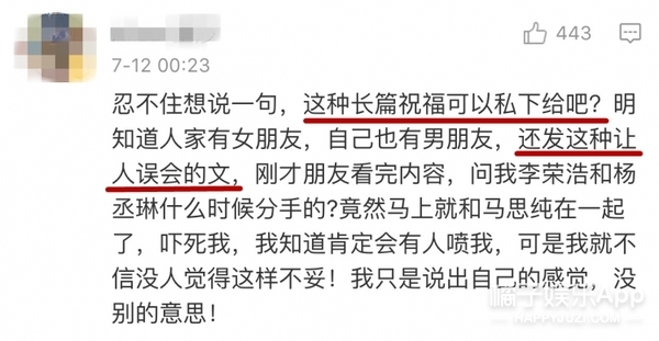 然而,評(píng)論的畫風(fēng)走向有點(diǎn)讓人意外。不少網(wǎng)友認(rèn)為馬思純有歐豪了,李榮浩也有楊丞琳了,這種長(zhǎng)文祝福信不應(yīng)該公開發(fā)↓