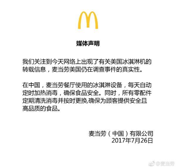 7月26日23時許,麥當(dāng)勞官方微博發(fā)布了《關(guān)于美國冰淇淋機的媒體聲明》:“我們關(guān)注到今天網(wǎng)絡(luò)上出現(xiàn)了有關(guān)美國冰淇淋機的轉(zhuǎn)載信息,麥當(dāng)勞美國仍在調(diào)查事件的真實性。在中國,麥當(dāng)勞餐廳使用的冰淇淋設(shè)備,每天自動定時加熱消毒,確保食品安全。同時,所有零配件定期清洗消毒并按時更換,確保為顧客提供安全且高品質(zhì)的食品?!?/p>
