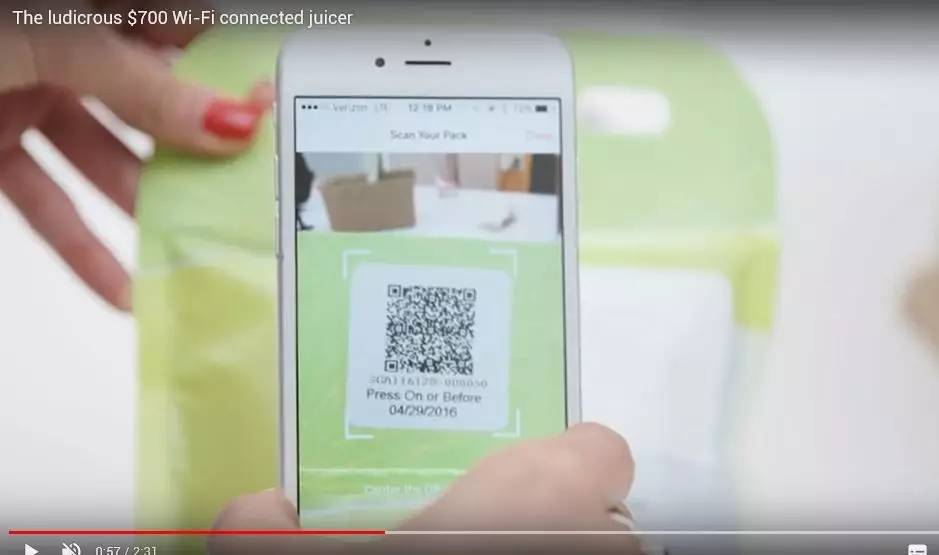 此外,這些主打互聯(lián)網(wǎng)概念的“果汁材料包”還有二維碼可供掃描。用戶掃碼之后,手機(jī)上可顯示出材料包內(nèi)商品的生產(chǎn)信息。并且聯(lián)網(wǎng)后的智能榨汁機(jī)還可以讀取這些信息。如果有變質(zhì)、過期的不新鮮材料包被投入機(jī)器,榨汁機(jī)將拒絕工作。