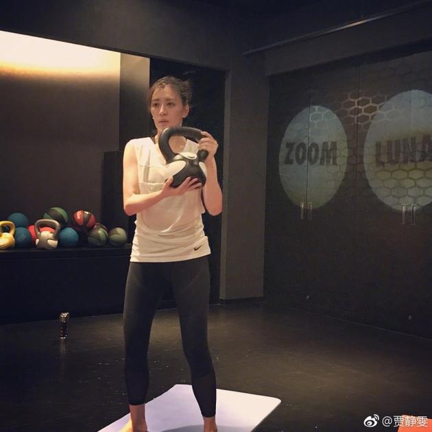 照片中賈靜雯素顏出鏡,身穿白色運(yùn)動(dòng)背心加上黑色彈力褲,長(zhǎng)發(fā)都扎成一個(gè)團(tuán)子束在腦后,舉著一個(gè)運(yùn)動(dòng)器械正在鍛煉臂力。