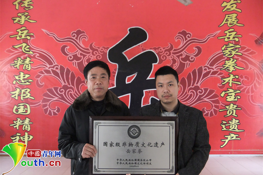 2008年,岳家拳正式被國務院批準為國家級非物質文化遺產。張業(yè)金(左)與張奇鋼(右)從北京捧回岳家拳非遺匾。