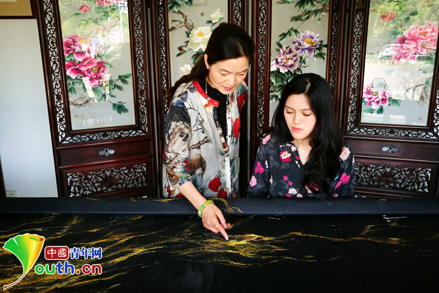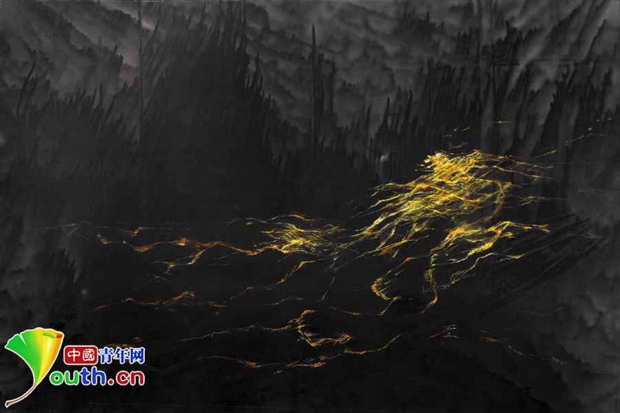 金線用蘇繡典型的平針繡法繡在真絲底料上,明暗金黃色從近處向遠處延伸,燈光照射下,一如夜空中的萬家燈火。若有燈光照射,參觀者會發(fā)現整個底料上還暗藏一幅潑墨山水畫。