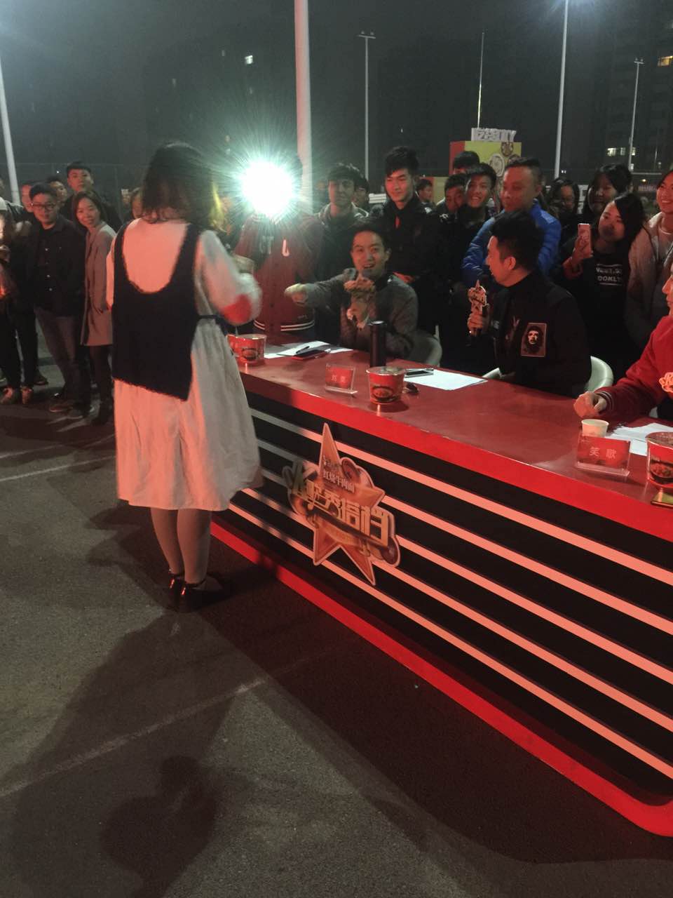 整場海選持續(xù)到天黑,非常有趣的是,可能是大家剛開始都持觀望態(tài)度,臨近天黑的時候,真正的好聲音才開始登上舞臺,比賽的十強(qiáng)幾乎都產(chǎn)生在最后上場的十位選手中,評委現(xiàn)場不僅在盲選,而且在不斷的更新五強(qiáng)的名單,以至于,最后覺得只選五強(qiáng)臺可惜了,在和導(dǎo)演組商議之后,晉級名額直接增加到了十個。他們將和前五場康師傅紅燒牛肉面《名嘴K歌秀》校園海選選拔出來的選手一起,參加《名嘴K歌秀》第三季,獲得和名嘴演唱的機(jī)會。