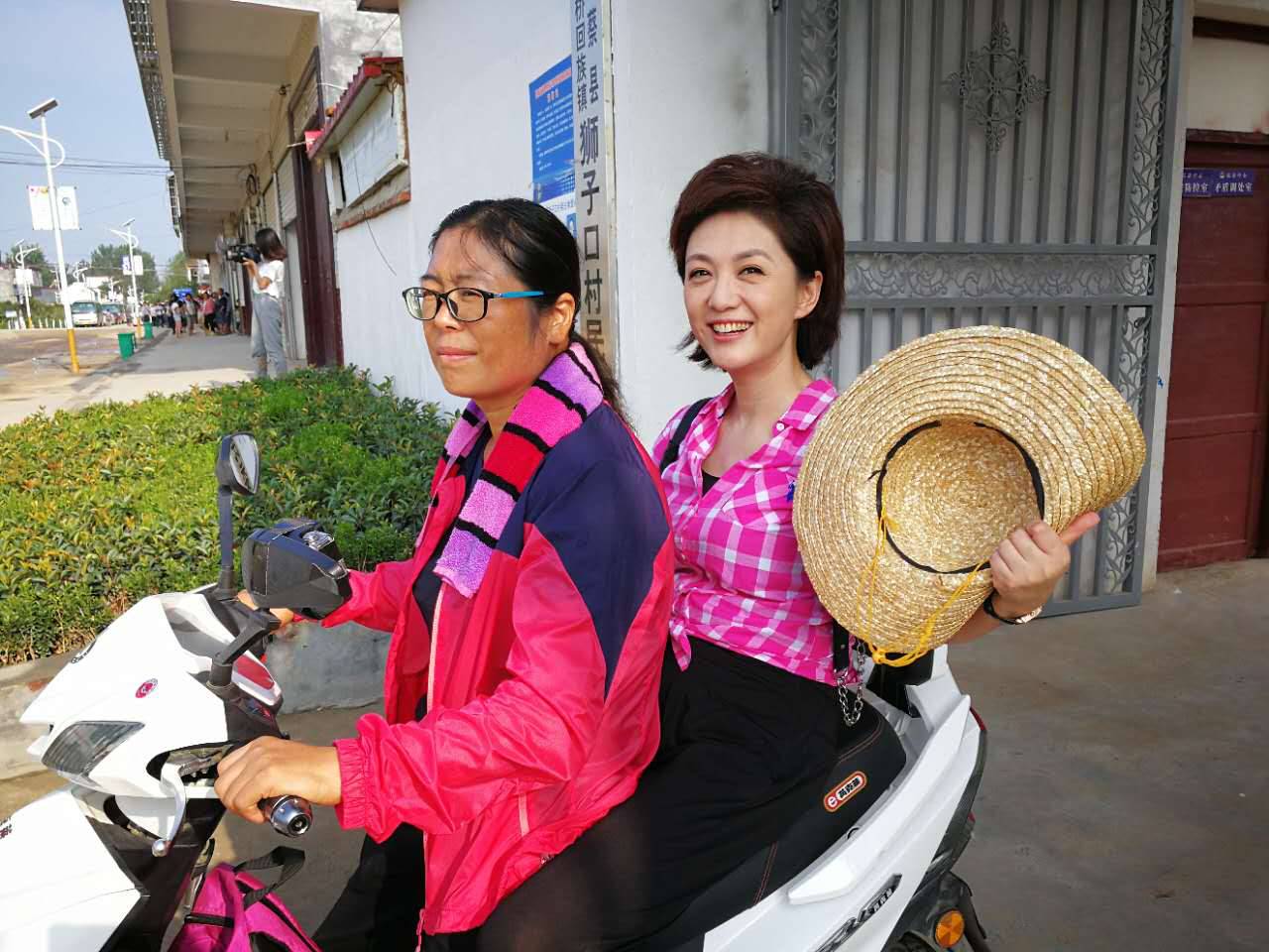 海霞和原玉榮走村串戶,都是坐著原玉榮的電動自行車。原玉榮擔(dān)心她坐不慣,可海霞毫無怨言,感覺很開心。一路在村子里走訪,村民們看到了原書記和坐在電動車上,頭戴草帽的海霞,紛紛向她們熱情的打招呼。