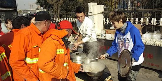 另一邊,在鄭州市花園路廣電南路交叉口,主持人劉雯和韓佳帶著十幾名義工早早的在路邊就開始忙活了。他們要給附近50多名環(huán)衛(wèi)工人煮餃子。平時,環(huán)衛(wèi)工們的午飯都很簡單,甚至都是隨便對付的,這次,主持人和義工們特意選在離工人們中午休息比較近的地方,搭起了臨時的灶臺,給工人們做上一頓熱騰騰的餃子。由于條件簡陋,臨時灶臺上的火十分不穩(wěn)定,劉雯和韓佳脫下厚重的外套,擼起袖子親自生火,費了好大勁終于把餃子下鍋了。吃上熱騰騰的餃子,環(huán)衛(wèi)工人們特別開心。一位老大爺由衷的感嘆道:“好久沒吃過這么暖心的午飯了,謝謝你們。”