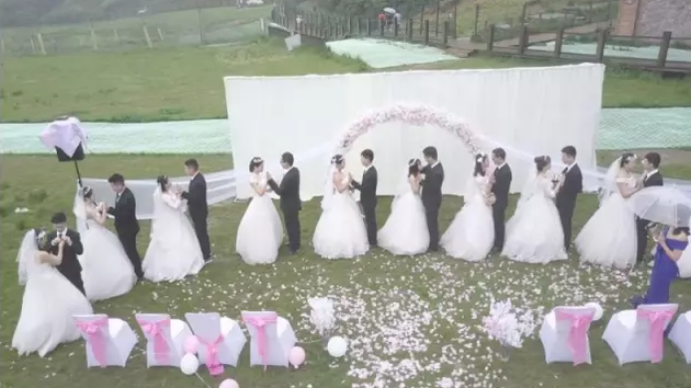 青山環(huán)抱的草坪中間,鮮花點綴,西服、婚紗、司儀……一樣不少,成對的新郎新娘溫情相擁,環(huán)繞的云霧和綿綿細雨,更為這場婚禮營造了浪漫的氣氛。據(jù)網(wǎng)上文章稱,婚禮現(xiàn)場的新郎、新娘們,是來自成都一高校工程造價管理專業(yè)大四一畢業(yè)班的15對情侶。