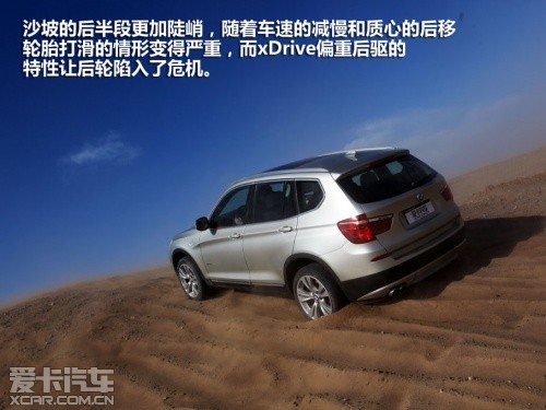 或許是奧迪Q5完成測試的過程比較順利,我們對接下來即將登場的寶馬X3也普遍比較看好,這或許就是思維慣性帶來的固定套路吧。然而在實地測試過程中,這臺X3攀爬沙丘的過程卻沒有表現(xiàn)出它在公路上所煥發(fā)出的霸氣。400?!っ椎淖畲笈ぞ卦诔鞘械缆分校踔猎诟咚俟飞隙际菬o與倫比的,但移步至眼前狂風(fēng)大作的沙丘,這400?!っ椎呐ぞ貏t像是心有余而力不足的悲情英雄。