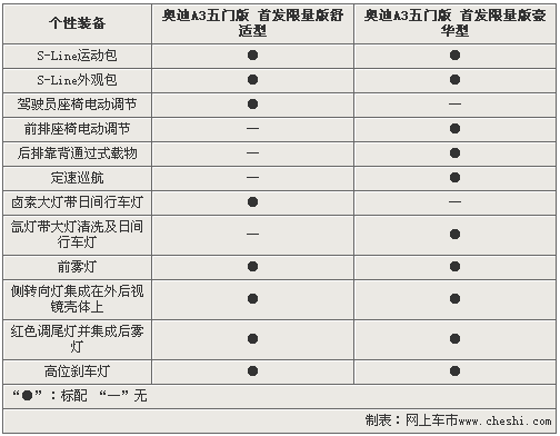 奧迪A3五門首發(fā)限量版舒適型和首發(fā)限量版豪華型基于配置的不同,將決定售價上的差異。奧迪A3五門首發(fā)限量版舒適型作為入門車型,取消了副駕駛座椅電動調節(jié)、定速巡航以及氙燈帶大燈清洗等配置。