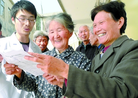 4月26日,湯陰縣白營鄉(xiāng)東木佛村老人們正在看自己的體檢報告。4月份,湯陰縣5萬多名60歲以上農(nóng)村老人享受到了一次免費健康體檢,體檢費用由政府買單。 常中正 攝