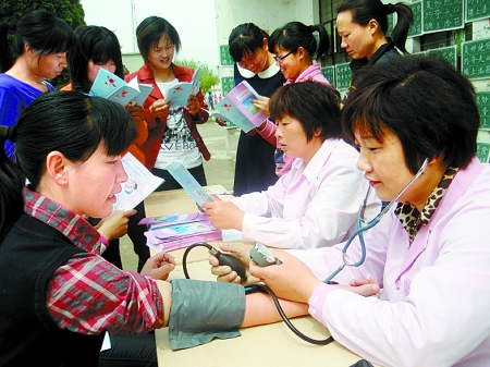 4月25日,商水縣舒莊鄉(xiāng)計生技術(shù)人員正在該鄉(xiāng)一中為教師進(jìn)行體檢?!拔逡弧鼻跋?,他們深入學(xué)校、機(jī)關(guān)、企業(yè)、田間,為辛勤工作在一線的廣大勞動者免費進(jìn)行健康檢查,并發(fā)放醫(yī)療保健知識手冊。 喬連軍 攝