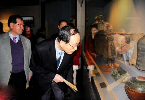 韓國朋友相繼參觀了河南博物院的《中原古代文明之光》基本陳列、《中原楚系青銅藝術(shù)館》、《河南古代玉器》、《河南明清館》等專題陳列的多個展覽。韓國朋友們精細地觀賞博物院陳展的文物,由衷感嘆中華民族祖先的智慧和博物院的陳列水準(zhǔn)。曾80多次訪華、第64次來河南的“中國通”許由先生頗為內(nèi)行的提問令講解員和陪同參觀的中國人員刮目相看。中韓建交的20多年來許先生一直在為兩國及兩國人民的友誼盡其所能地做著工作,他曾多次率團訪華,此次又為河南帶來了原首爾特別市瑞草區(qū)廳長趙南浩、原空軍士官學(xué)校校長吳昌煥和金星綜合電機株式會社會長等新老朋友。