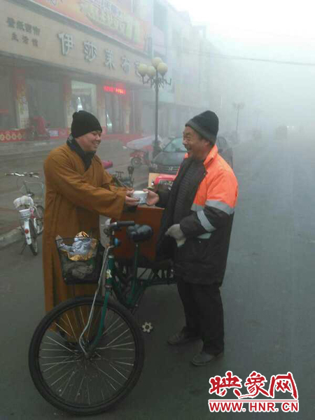 僧人名叫釋妙亮,是滎陽(yáng)市豫龍鎮(zhèn)興國(guó)寺法師。他說(shuō),早上6天他們出發(fā)了,截止早上7時(shí)30分,他們已經(jīng)免費(fèi)送了三桶臘八粥。