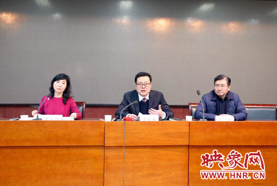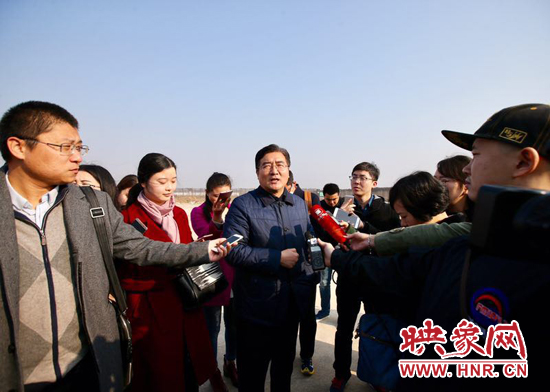 鄭州市上街區(qū)區(qū)委副書記李新軍(中)向記者介紹鄭州通航試驗(yàn)區(qū)情況。映象網(wǎng)記者 段晉哲/攝