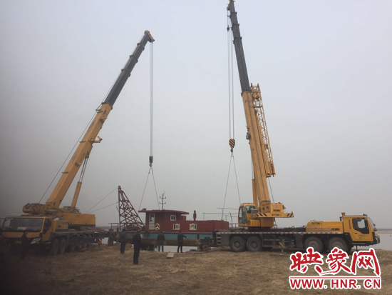 28日上午9時許,滎陽市多個執(zhí)法部門人員趕到王村鎮(zhèn)丁村黃河邊一處非法采砂船邊。經(jīng)過詢問得知,該船只重達(dá)70噸,必須由兩輛百噸大吊車同時起吊,才能將其吊離上岸。