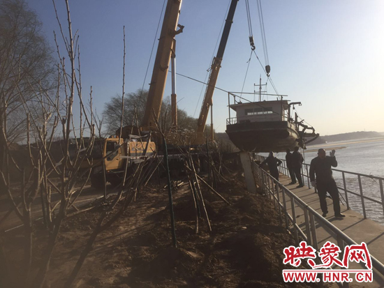 3月1日,執(zhí)法人員又來到汜水鎮(zhèn)趙村沙場岸邊,對一艘重達(dá)50噸的非法采砂船進行起吊離上岸。