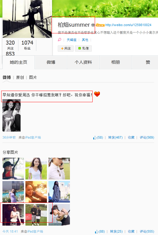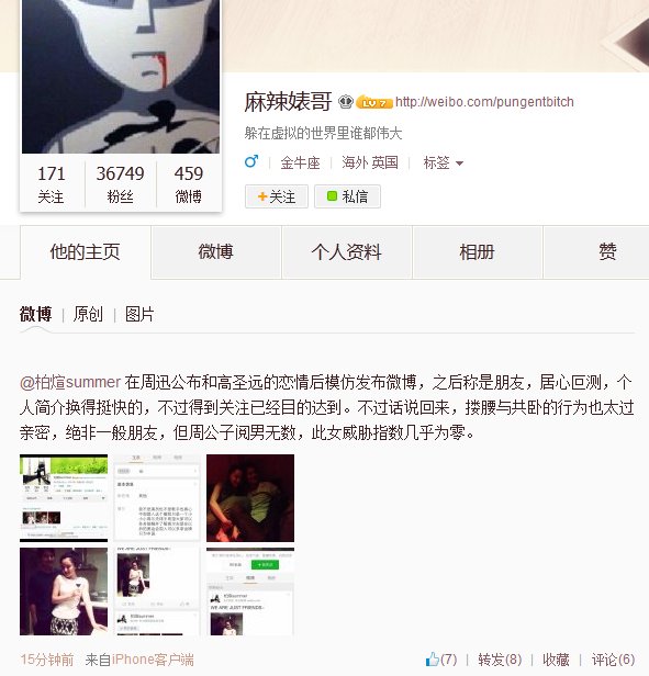 該微博也引起了不少熱心網(wǎng)友的注意,微博@麻辣婊哥懷疑@柏煊summer在刻意炒作,微博稱:“@柏煊summer 在周迅公布和高圣遠的戀情后模仿發(fā)布微博,之后稱是朋友,居心叵測,個人簡介換得挺快的,不過得到關(guān)注已經(jīng)目的達到。不過話說回來,摟腰與共臥的行為也太過親密,絕非一般朋友,但周公子閱男無數(shù),此女威脅指數(shù)幾乎為零。 ”