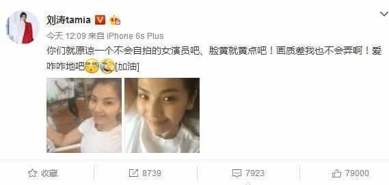近期,劉濤在微博上面曬出了兩張照片,附文“你們就原諒一個(gè)不會(huì)自拍的女演員吧、臉黃就黃點(diǎn)吧!畫質(zhì)差我也不會(huì)弄??!愛咋咋地吧”!