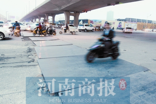 昨天下午,記者在現(xiàn)場看到,隴海高架橋黃河南路(西向東方向)下橋口南北兩側(cè),20余塊鋼板一字鋪開,鋼板路長約50米、寬約2米,車輛經(jīng)過時(shí),鋼板與路面不斷發(fā)出沉悶的撞擊聲。