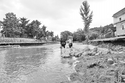 新縣卡房鄉(xiāng)因橋被洪水沖斷,群眾只能涉水過河。記者何正權李鑫攝影