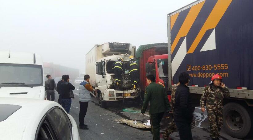 據(jù)現(xiàn)場(chǎng)郭先生描述:大概有4輛貨車,1輛中巴車,4輛私家車連環(huán)追尾,他就在這幾輛事故車后方,當(dāng)時(shí)受大霧影響,能見度50米左右,前方堵車,結(jié)果這幾輛車都沒剎住,直接相繼撞上了,郭先生說“幸虧當(dāng)時(shí)我車速不算快,及時(shí)把車剎住,不然前方就是一輛貨車,撞上去的話后果不堪設(shè)想,現(xiàn)在我的手都是抖的,太恐怖了”。