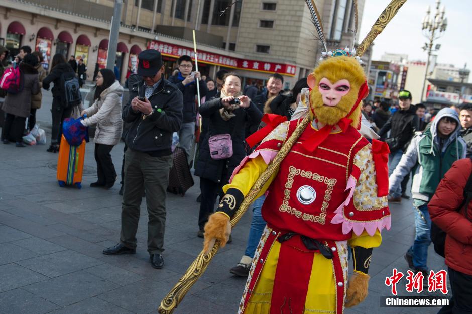 1月25日,一名孫悟空扮相的旅客“快閃”現身北京站,引發(fā)周圍旅客和民眾圍觀。中新社發(fā) 崔楠 攝