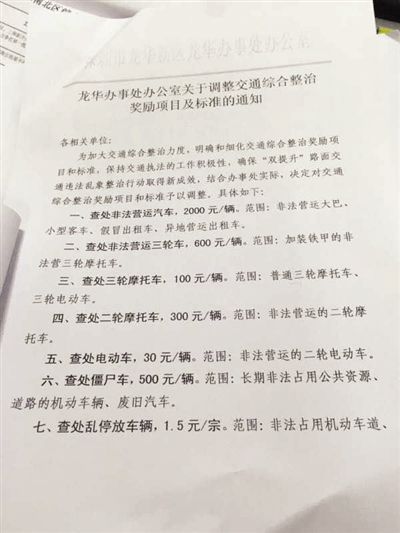 記者在一份由深圳龍華新區(qū)龍華辦事處辦公室出具的《關(guān)于調(diào)整交通綜合整治獎勵項目及標準的通知》的文件中發(fā)現(xiàn),為加大交通綜合整治力度,明確和細化交通綜合整治獎勵項目和標準,保持交通執(zhí)法的工作積極性,辦事處決定對交通綜合整治獎勵項目和標準予以調(diào)整,其中加裝鐵甲的非法營運三輪車每查處一輛獎勵600元,普通三輪摩托車、三輪電動車每輛獎勵100元,對無證駕駛、妨礙執(zhí)法當事人實施行政拘留的,拘留一人獎勵500元。