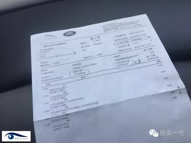 在客戶提供的“施工單”復(fù)印件上,前街一號記者看到上面記錄了陳先生的個人及所購車輛詳細(xì)信息。在“描述”一欄中,記者看到了包括“橫撐桿發(fā)生咯吱聲”、“后彈簧發(fā)出咯吱聲”、“車頂天窗面板空氣倒流板彈簧移位”等六條記錄,且每條記錄后均有以“K”打頭的活動編號。