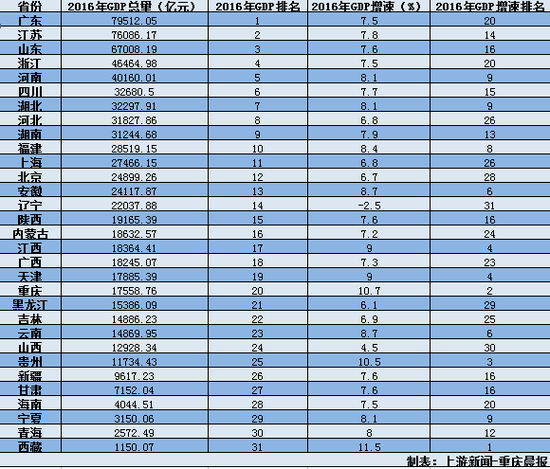 上游新聞-重慶晨報記者發(fā)現,31省市區(qū)呈現把2017年預期目標基于2016年實際增速稍稍調低的趨勢。例如新疆GDP2016年實際增長7.6%,其2017年預期目標定為增長7%以上;重慶GDP2016年實際增長10.7%,其2017年目標增長10%。