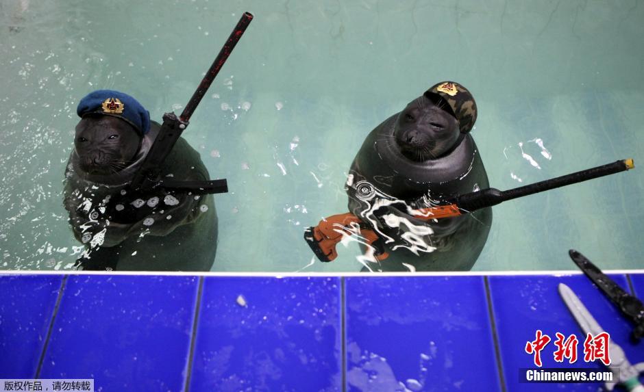 當?shù)貢r間5月9日,莫斯科紅場舉行盛大閱兵式慶祝衛(wèi)國戰(zhàn)爭勝利70周年。在俄羅斯的伊爾庫茨克水上公園里,海豹們也身著“軍裝”認真的在水中列隊接受訓(xùn)練員的檢閱。