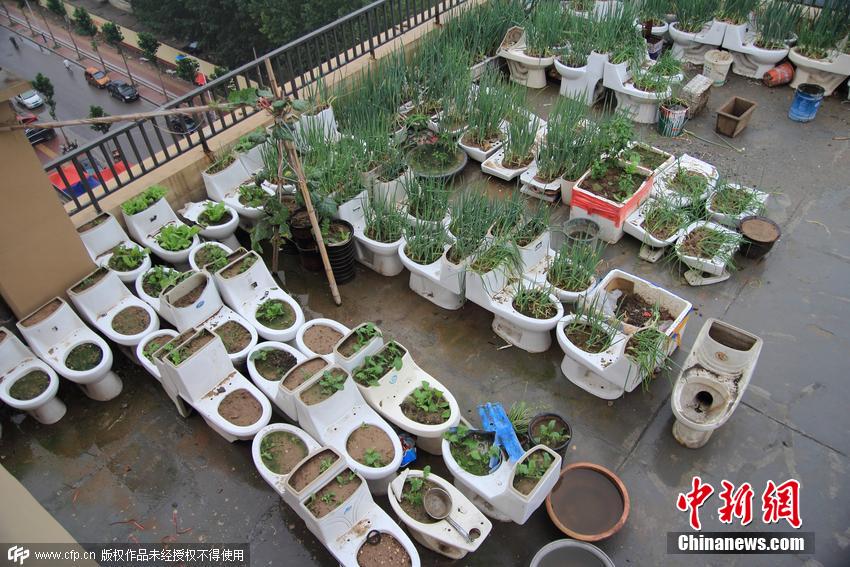 2015年07月16日,山東省菏澤市,在中央公館小區(qū)21號樓樓頂?shù)南榔脚_上,有業(yè)主擺放了數(shù)十個廢棄馬桶,種上了各種蔬菜。還用廢舊沙發(fā)搭起了鴨棚,養(yǎng)起了鴨子。在樓頂?shù)慕锹淅?,記者還發(fā)現(xiàn)了一個簡易廁所。該樓居民表示,“菜園”的主人平時就直接使用廁所糞便作為蔬菜的肥料。天氣炎熱時,氣味很大,附近居民苦不堪言。