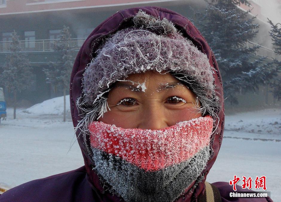 12月26日,內(nèi)蒙古呼倫貝爾,受強(qiáng)冷空氣影響,呼倫貝爾市境內(nèi)各地遭遇極端低溫天氣。圖為當(dāng)日?qǐng)D里河鎮(zhèn)最低氣溫達(dá)-42℃,低溫使市民的臉上瞬間結(jié)滿冰霜。 圖片來(lái)源:視覺(jué)中國(guó)