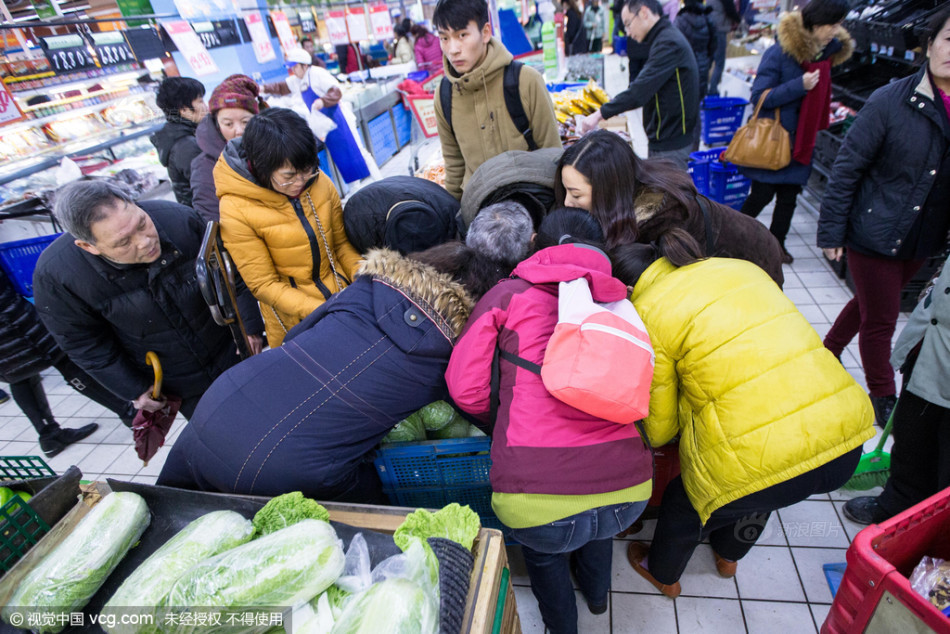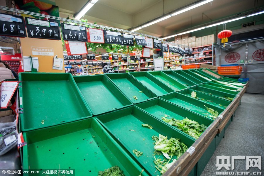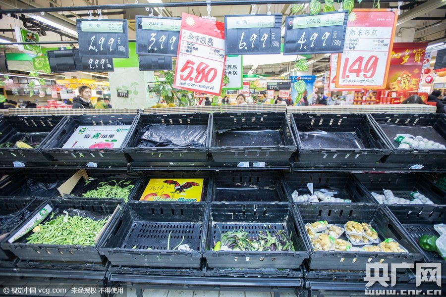 2016年1月20日,浙江省杭州市,杭州市氣象臺(tái)發(fā)布暴雪黃色預(yù)警信號(hào)。寒潮將至,市民紛紛囤積食品,眾多貨架被一搶而空。