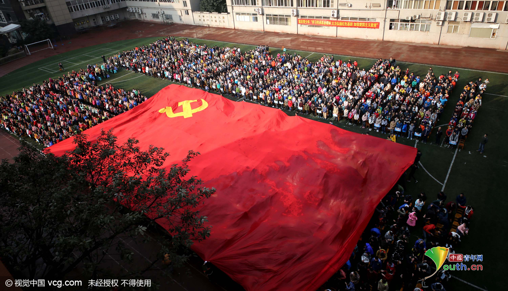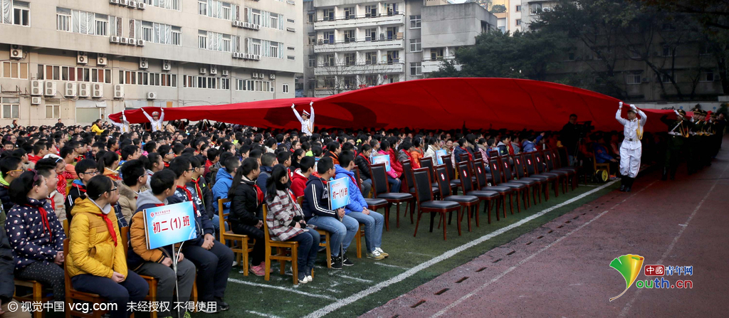 2016年02月24日,重慶市新區(qū),渝高中學(xué),開(kāi)學(xué)典禮上同學(xué)們傳遞一面90米寬的巨大黨旗。開(kāi)學(xué)第一課由聶榮臻元帥陳列館報(bào)告團(tuán)成員為同學(xué)們宣講老一輩無(wú)產(chǎn)階級(jí)革命家的豐功偉績(jī)。視覺(jué)中國(guó)