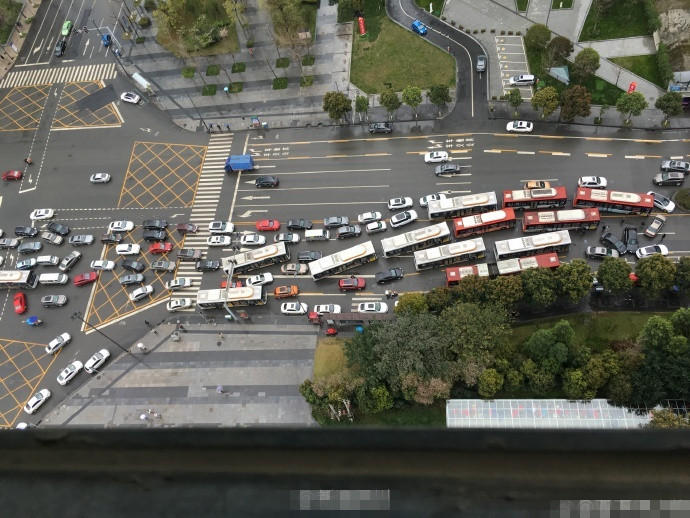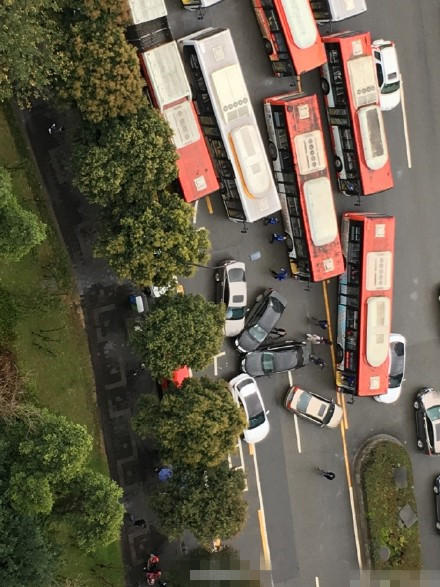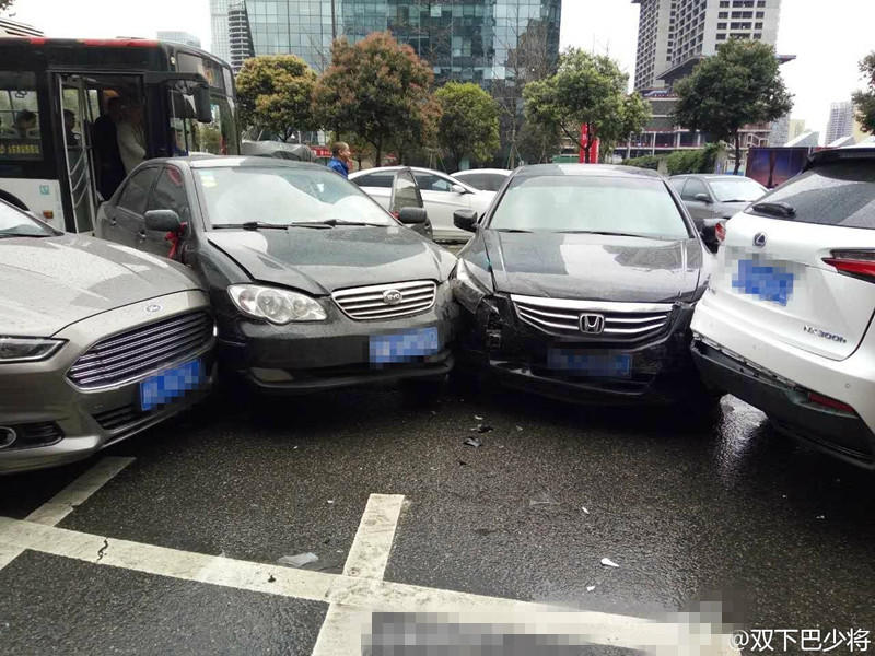 成都益州大道和交子大道大道路口發(fā)生車禍,4輛汽車撞擊在一起,造型別致。(圖文來(lái)源:微博網(wǎng)友)