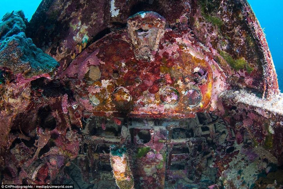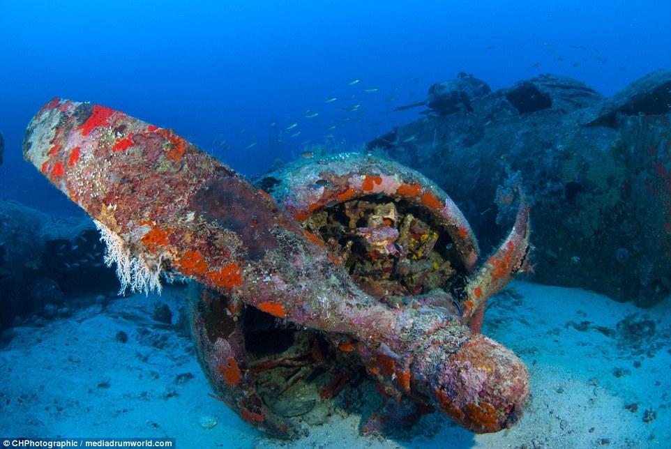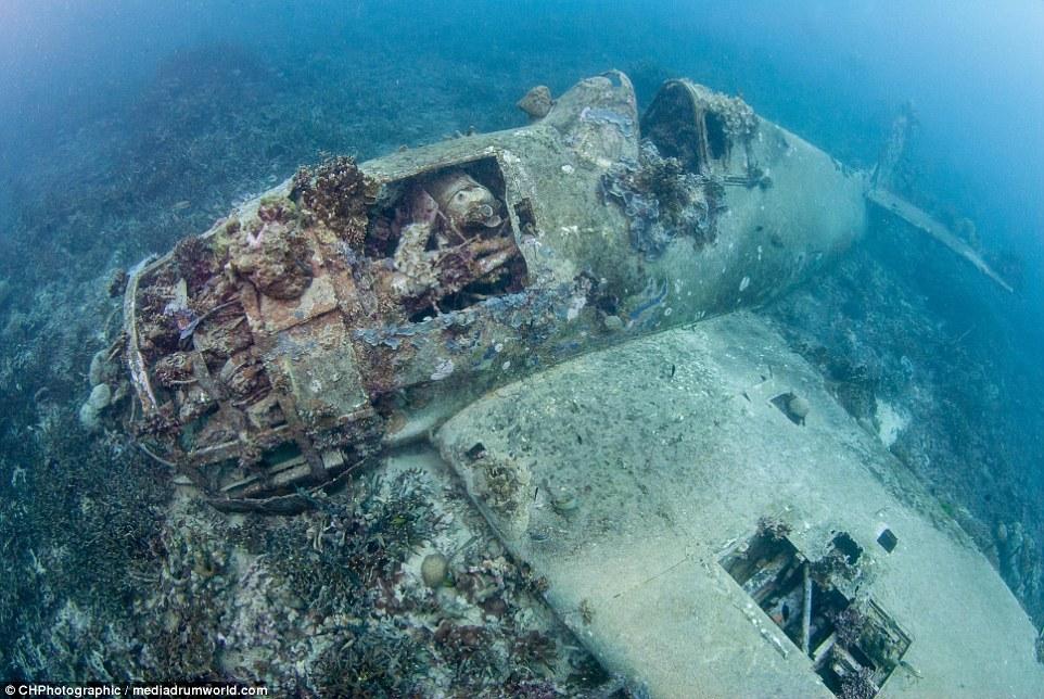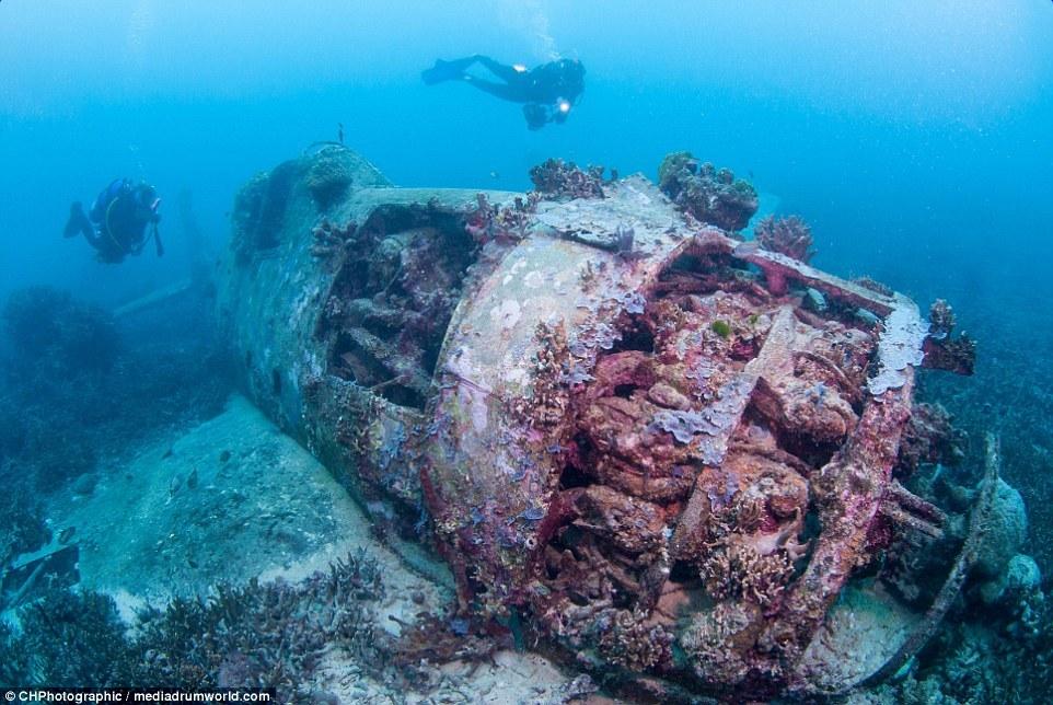 這些曾經(jīng)參與世界大戰(zhàn)的戰(zhàn)斗機(jī)如今安靜的躺在所羅門群島大海185英尺(約56米)的淺層海床上。今夕形成了鮮明的對比,英勇的美國F6F地獄貓戰(zhàn)斗機(jī)上覆蓋了大量的珊瑚。