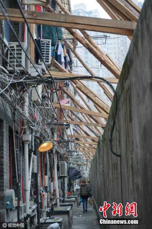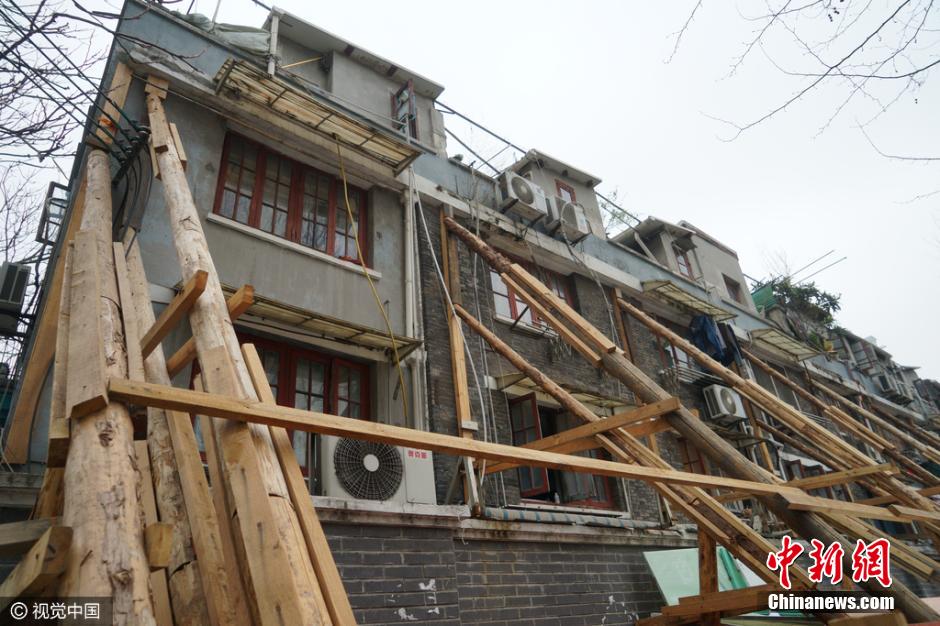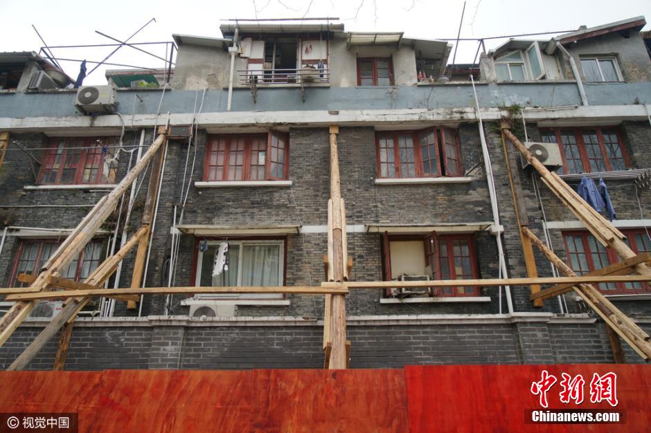 3月13日,上海黃浦區(qū),黃陂南路永年路一石庫(kù)門舊里房屋發(fā)生傾斜開裂,外墻用數(shù)十根木棒進(jìn)行加固,場(chǎng)面十分壯觀,不少路人走過(guò)時(shí)都加快了腳步。據(jù)了解,此處房屋開裂傾斜是由于相隔一條馬路的兩個(gè)建筑工地野蠻施工造成。此段居民小區(qū)為上世紀(jì)20年代建成的磚木結(jié)構(gòu)石庫(kù)門建筑,房齡至今已經(jīng)90余年,受影響的居民就多達(dá)幾十戶。 圖片來(lái)源:視覺中國(guó)