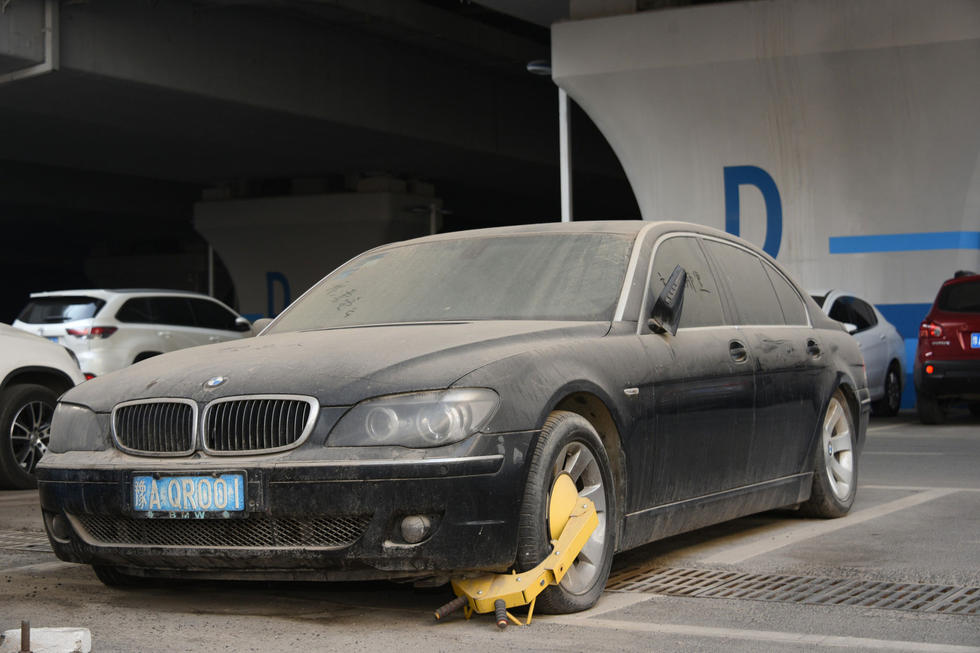上午7時30分,中興路附近的高鐵站北區(qū)停車場,在入口處東側(cè),這輛“蓬頭垢面”的寶馬車車全身落滿了塵土,已呈灰色。其實,這是一輛價值過百萬的黑色寶馬750LI。該車的右前后輪已經(jīng)癟了,左前輪被上了鎖。在車后備箱左側(cè)上方有一處凹陷,但不太明顯。后引擎蓋上被人寫上“下雨了”字樣。車的縫隙處堆積著厚厚的塵土,顯然,這輛寶馬車已經(jīng)在此停放已經(jīng)有很長時間了。