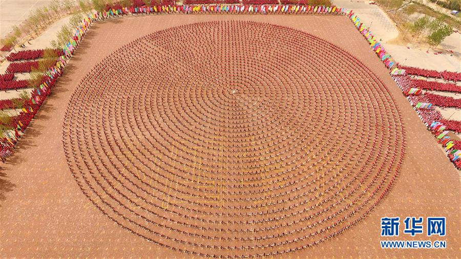 4月7日,在河南登封少林塔溝武術(shù)學(xué)校練功場,上課間操的學(xué)員擺出圓形圖案。當(dāng)日,河南登封少林塔溝武術(shù)學(xué)校2016年“春訓(xùn)”拉開帷幕,2.6萬名學(xué)員同上陣,進(jìn)行隊(duì)形變換、十八般兵器、少林硬氣功、少林集體棍等多種功法演練。“春訓(xùn)”是少林塔溝武術(shù)學(xué)校每年春季開展的一項(xiàng)強(qiáng)化訓(xùn)練活動(dòng),旨在提升學(xué)員的耐力和競技狀態(tài)。新華社發(fā)(牛書培 攝)