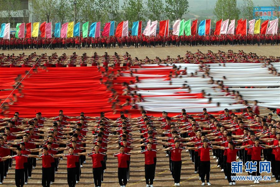 4月7日,在河南登封少林塔溝武術(shù)學(xué)校練功場,上課間操的學(xué)員進(jìn)行隊(duì)形變換。當(dāng)日,河南登封少林塔溝武術(shù)學(xué)校2016年“春訓(xùn)”拉開帷幕,2.6萬名學(xué)員同上陣,進(jìn)行隊(duì)形變換、十八般兵器、少林硬氣功、少林集體棍等多種功法演練。“春訓(xùn)”是少林塔溝武術(shù)學(xué)校每年春季開展的一項(xiàng)強(qiáng)化訓(xùn)練活動(dòng),旨在提升學(xué)員的耐力和競技狀態(tài)。新華社發(fā)(牛書培 攝)