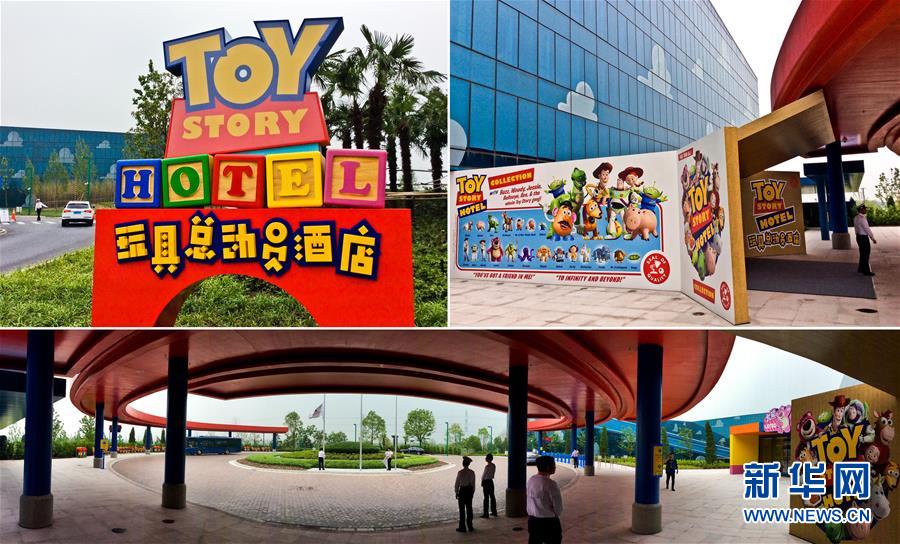5月15日拍攝的上海迪士尼玩具總動員酒店入口標(biāo)志(左上)、酒店大門(右上)和酒店大堂(下)(拼版圖片)。當(dāng)日,上海迪士尼主題酒店之——玩具總動員酒店大堂、廣場、餐廳、度假區(qū)短駁車等區(qū)域及設(shè)施開始內(nèi)部測試。這家共有800個(gè)房間的主題酒店將于6月中旬正式迎客。新華社發(fā)(鈕一新 攝)